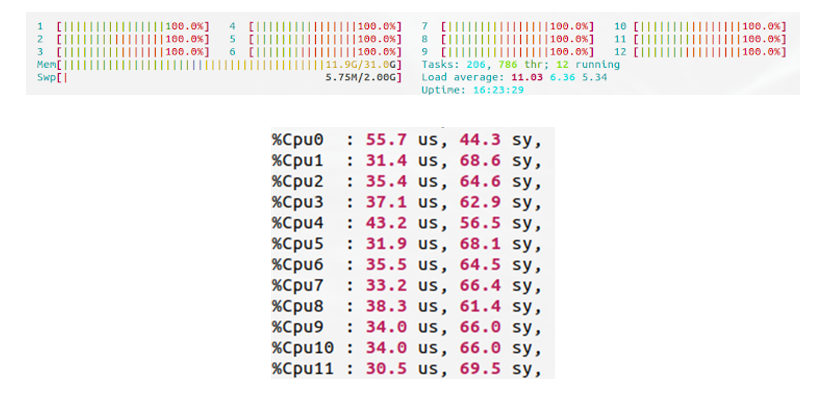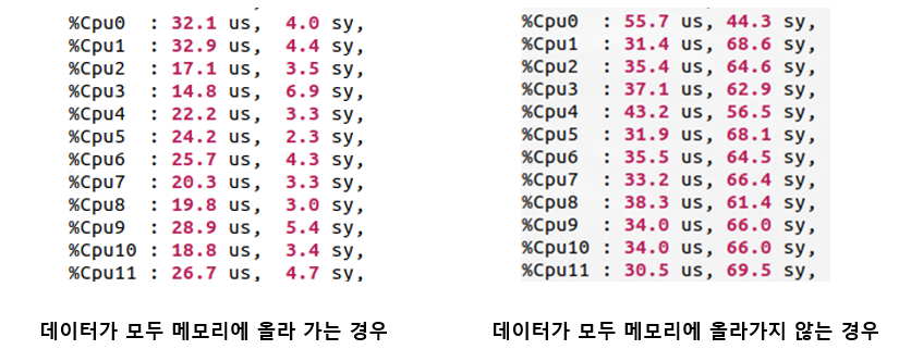 데이터가 모두 메모리에 올라가지 않을 때 관찰한 CPU 스탯이다. 위 사진의 빨간색과 아래 사진의 sy 값은 모두 CPU가 Kernel Mode로 돌아가는 비율을 의미한다. 이 수치가 높은 이유는 디스크에서 메모리로 데이터를 올리는 것이 너무 느리기 때문이다. 즉, 디스크에서 메모리로 데이터를 올리는 게 느려 계속 Request가 쌓이는 중이다. 이러면 아직 디스크에서 메모리에 데이터가 올라오지 않아 Batch를 만들지 못하기에 우리의 중요한 목표 "GPU에서 한 Batch 학습이 끝나기 전에 다음 Batch 메모리에 준비하기"가 실패하게 된다.