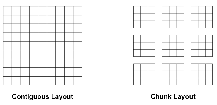 Layout이란 다차원의 Dataset을 연속적인 File에 Mapping 시키는 방법을 말하는데, HDF5에는 Contiguous Layout과 Chunk Layout이 있다.