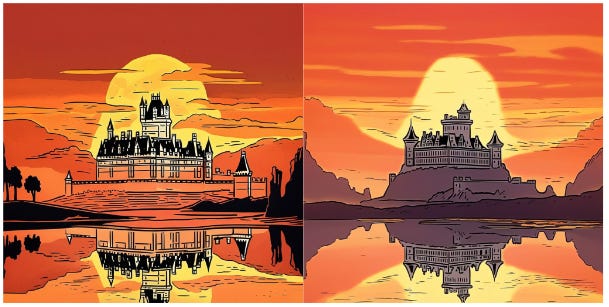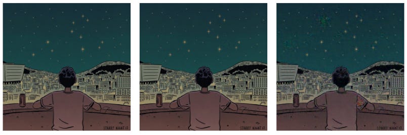 왼쪽 사진이 독이 든 그림 15장으로 학습한 AI가 생성한 이미지였습니다! GrimB 작가님의 원래 스타일에 비해 그림의 대비가 너무 뚜렷한 것 느껴지시나요? 독 그림을 먹었더니 AI가 스타일을 제대로 학습하지 못한 것 같네요.