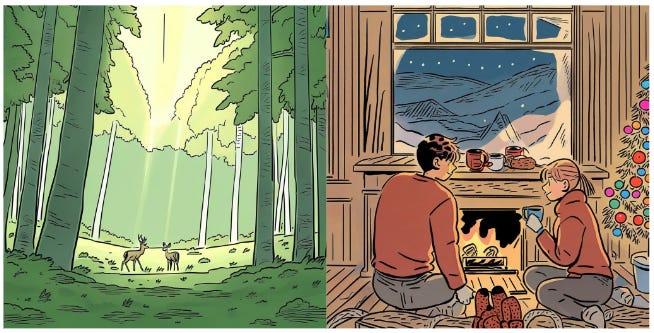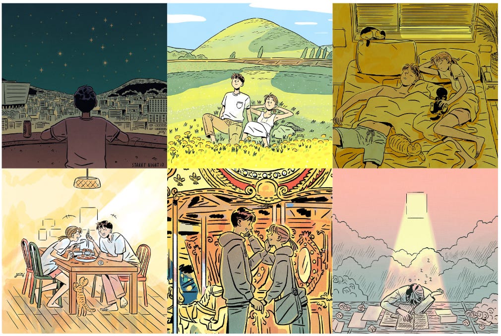 제가 굉장히 좋아하는 GrimB 작가님의 그림들인데요. 얇은 선들을 잘 살리고 명암 표현이 뛰어나며, 따뜻한 파스텔 계열의 색들을 잘 사용하는 작가님입니다. 그런데 사실 두 장 중 한 장은 AI가 생성한 그림인데요. 어떤 그림이 AI가 생성한 그림인지 아시겠나요?