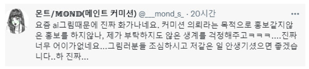 이처럼 최근에 AI로 특정 작가님의 그림체를 학습하는 것이 쉬워지면서 여러 문제가 발생하고 있는데요. 대표적으로 AI로 그린 그림을 올리고 본인이 작가인 척 행세하며, 부당한 이득을 취하는 사람들이 생겼다는 것입니다.